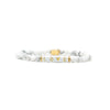 Materials: 3mm square acrylic letter beads in white/gold with 3mm faceted howlite on stretchy cord with 14K gold plated heishi beads and a heart bead enclosure.