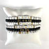Materials: 3mm square acrylic letter beads in black/gold with 3mm matte onyx on stretchy cord with 14K gold plated heishi beads and a heart bead enclosure.