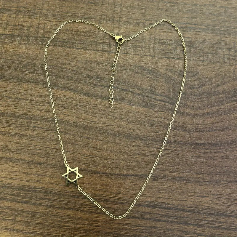 This necklace features a 1/2" Star of David open-work charm that is offset on a 14" chain with 2" extender.