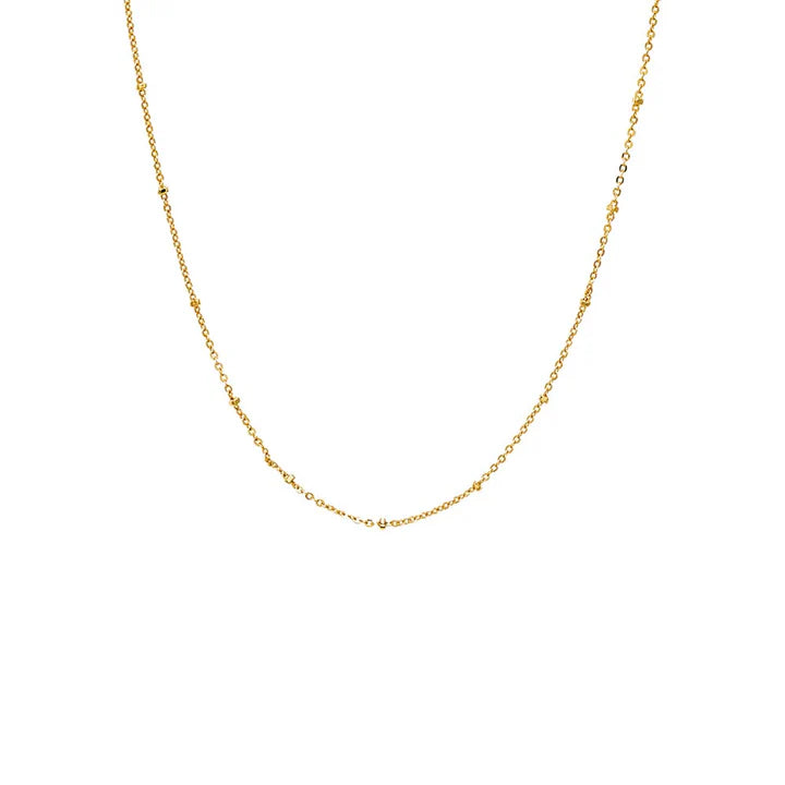 The Solid Ball Chain Necklace is a sleek and modern piece, crafted from brass and coated in radiant 14K gold plating for a touch of subtle elegance. With a delicate 1mm thickness, this necklace features a series of tiny, polished gold balls that create a unique texture, adding a hint of shine to any look. it’s versatile enough for layering or wearing solo as a minimalist statement.