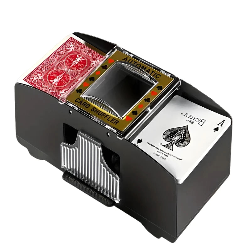 Make your car game easier with this automatic card shuffler. Shuffles two decks of cards. For all standard-sized cards.