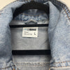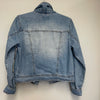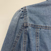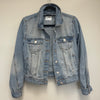 Large- traditional denim jacket with no rips or gathers at shoulder