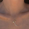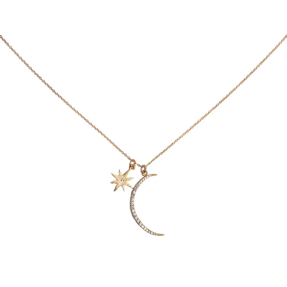 This elegant and whimsical necklace uses an 18k gold filled chain designed with a twinkling crescent-moon pendant and a pretty cubic zirconia and matte gold star charm. Great alone or for layering.