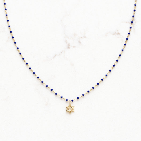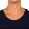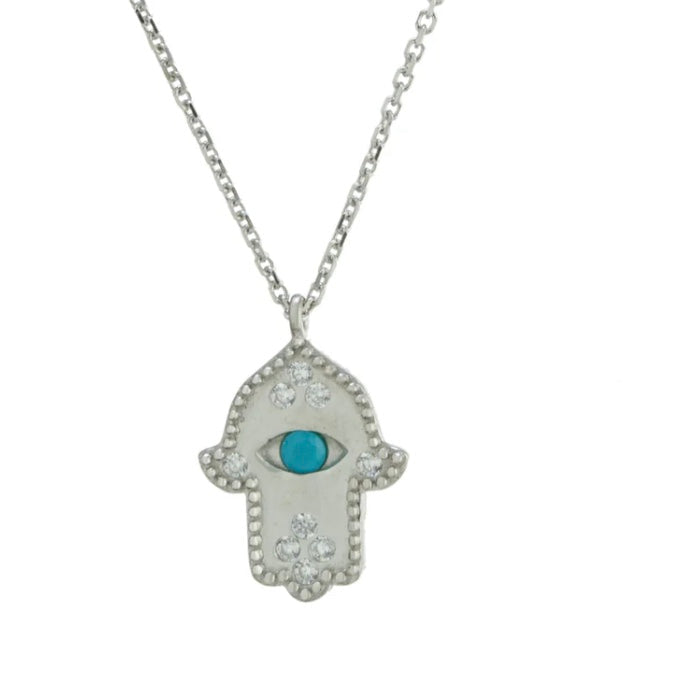 This silver necklace features a 1/2"L x 3/8"W hamsa charm embellished with cz and a blue center stone.