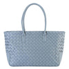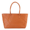 Experience the fusion of style and function with this woven tote bag. Features a stitched handle and a cross woven design. Zip top with two interior slip pockets and one zip pocket.