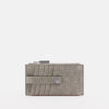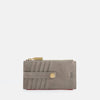 - Textured leather card case with snap and zip closure.
