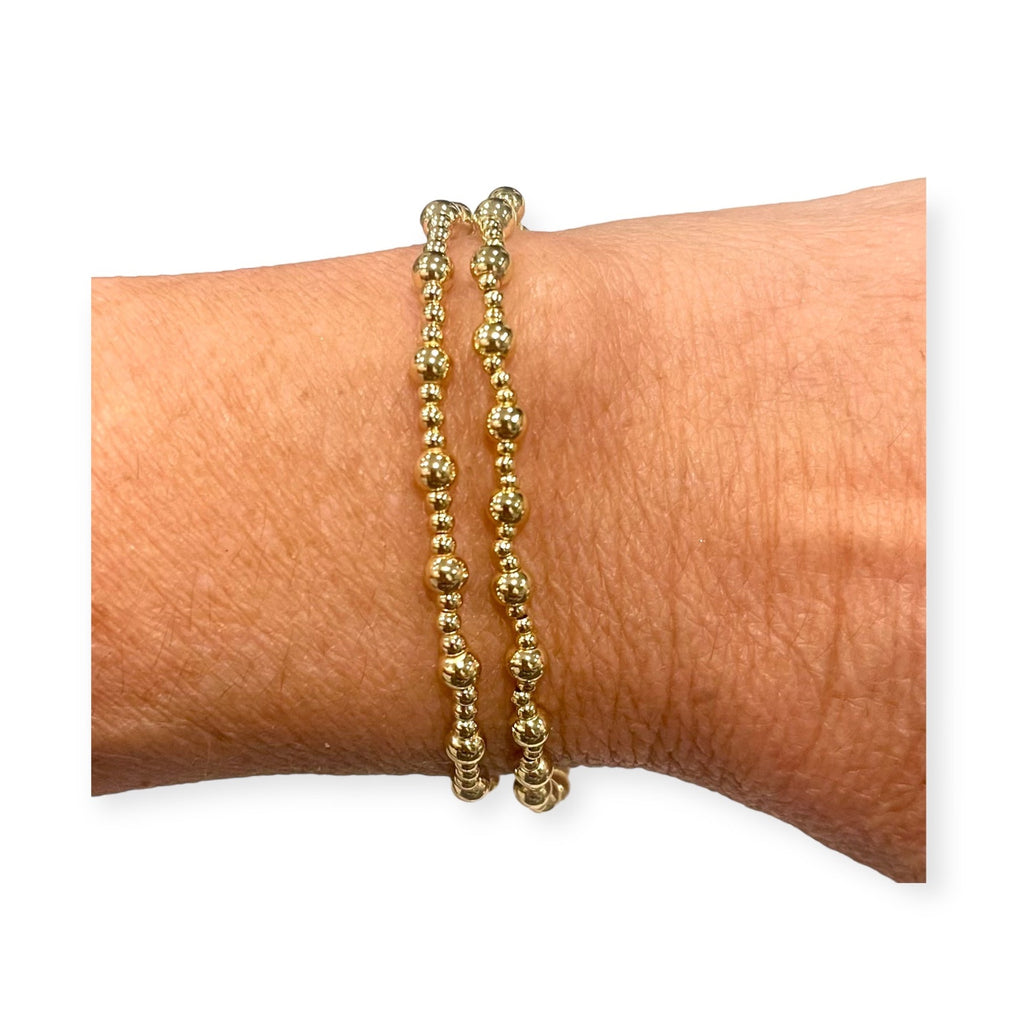 Add texture to your stack by using different sized metallic beads. The Beaded Stretch Bracelet alternates 5-2mm/1-4mm, 5- 2mm then 1 - 4mm. Measures 6.85" and will stretch to go over your wrist.