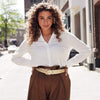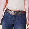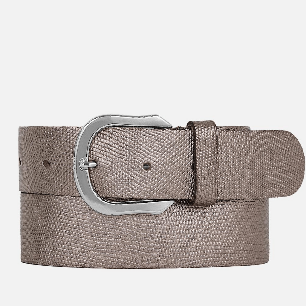 Add a luxe finish to your outfit courtesy of Amsterdam Heritage's Dana belt. The metallic foil texture replicates that of iguana skin adding an exotic edge to this glamorous metallic belt featuring a classic buckle. From lunch dates to dinner parties, buckle up in style with this staple from our Amsterdam Heritage Luxe Collection! Available in gold & platinum.