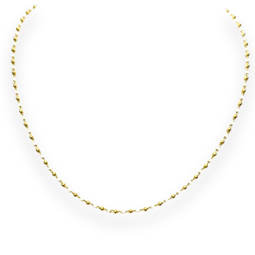 This gold necklace features alternating white barrel beads with 2mm gold beads.