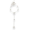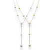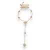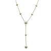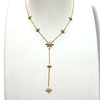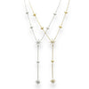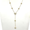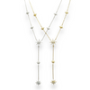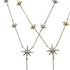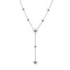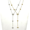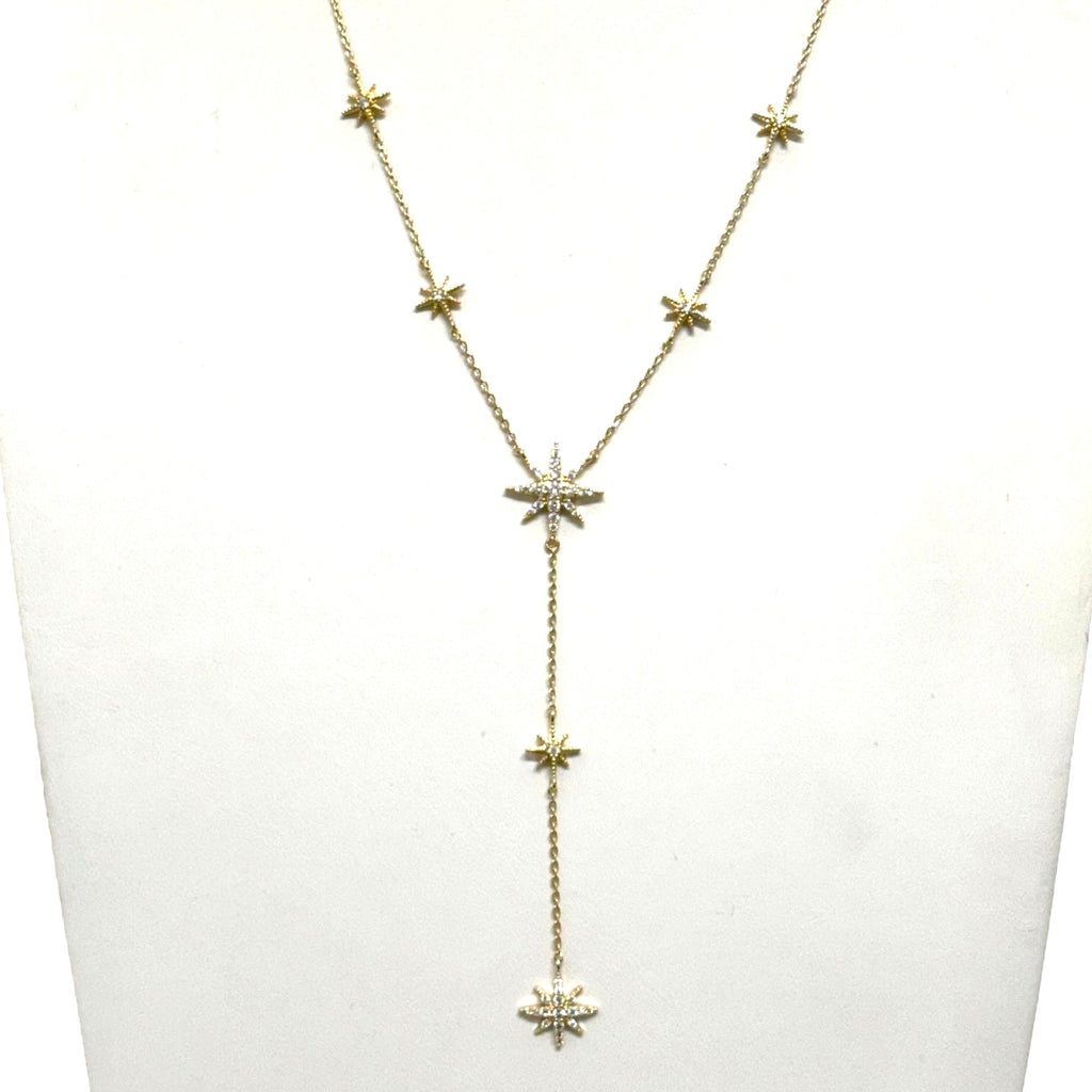 This lariat style necklace features small stars with a cz center and two larger cz pave stars. Necklace is 16" w/ 3" drop; 2" extender and lobster claw closure.