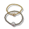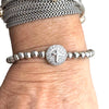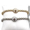 This 5mm beaded stretch bracelet features a 1/2" diameter pave circle charm with a cross in the center.