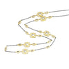 This dramatic long necklace features 3/4"L x 1/2"W pave rectangles surrounging clear crystals set in matte gold as well as smaller clear crystals surrounded with clear cz. Chain is matte black and is 35" long. Lobster clasp closure.