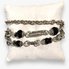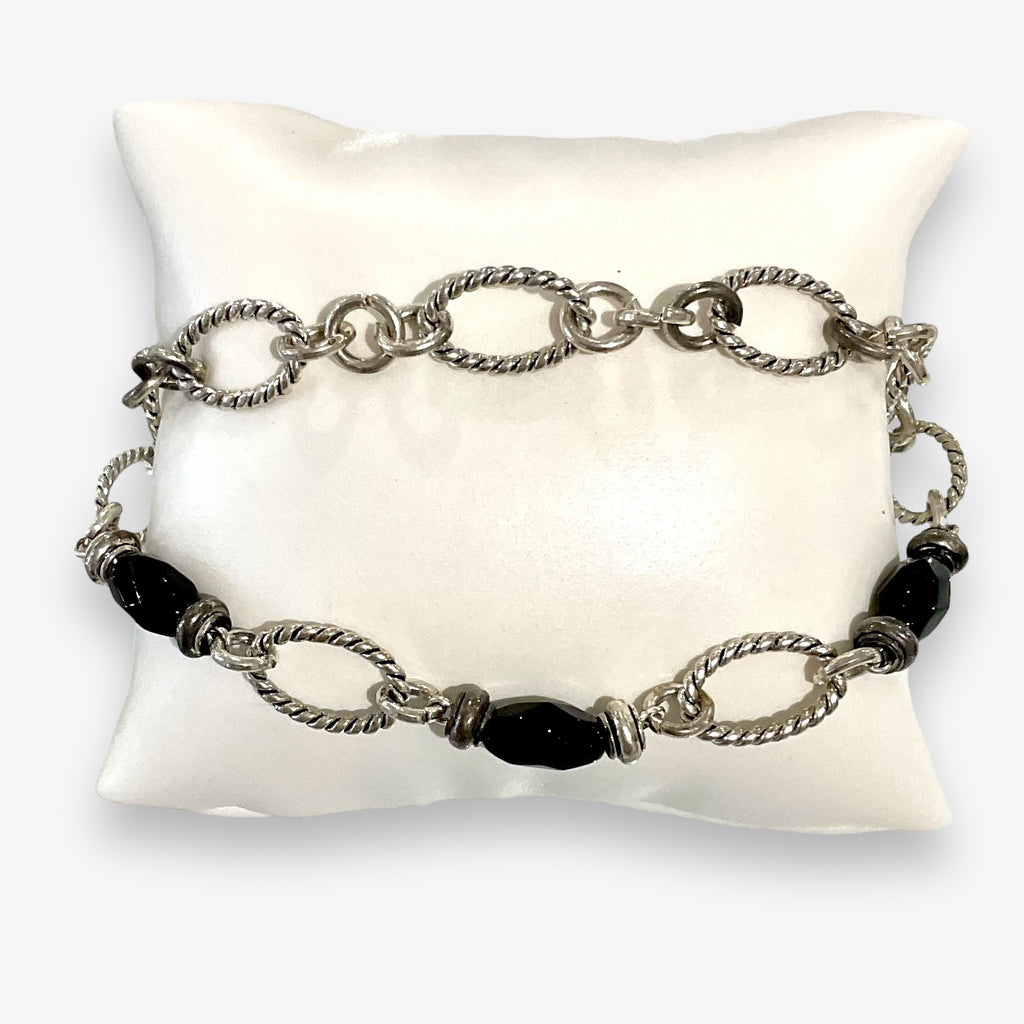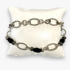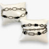 Silver bracelets with 2 or 3 chain layers. Include black longer beads on the 2 layer bracelet and black round beads on the 3 layer bracelet. The chain is roped and paperclip.