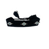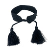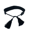 Black adjustable woven bracelet with 6" x 3/4" woven band and tassel ends