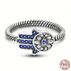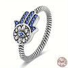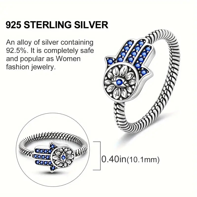Braided look sterling band with blue cz fingers and an evil eye/flower center