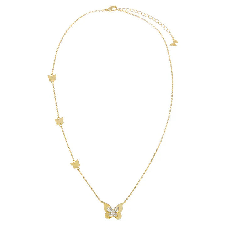 This gold necklace features a 5/8"W x 1/2"H gold butterfly charm with a cz butterfly inset and three more 1/4" diameter butterflies fluttering up one side.
