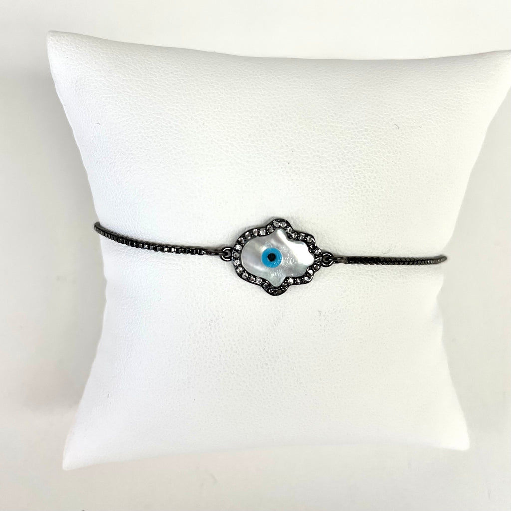 Hematite Chain attaches to the CZ encrusted mother of pearl hamsa .