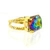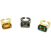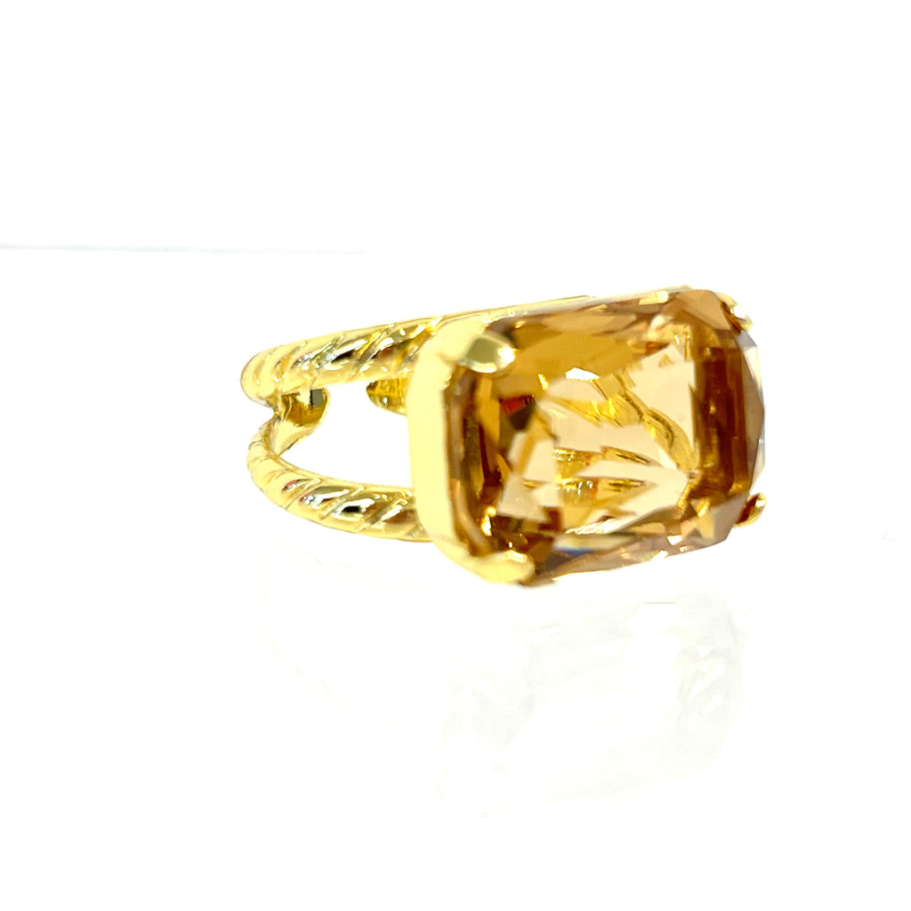 This beautiful adjustable gold ring has an emerald cut bagette. It is one inch long and 1/2 inchwide.