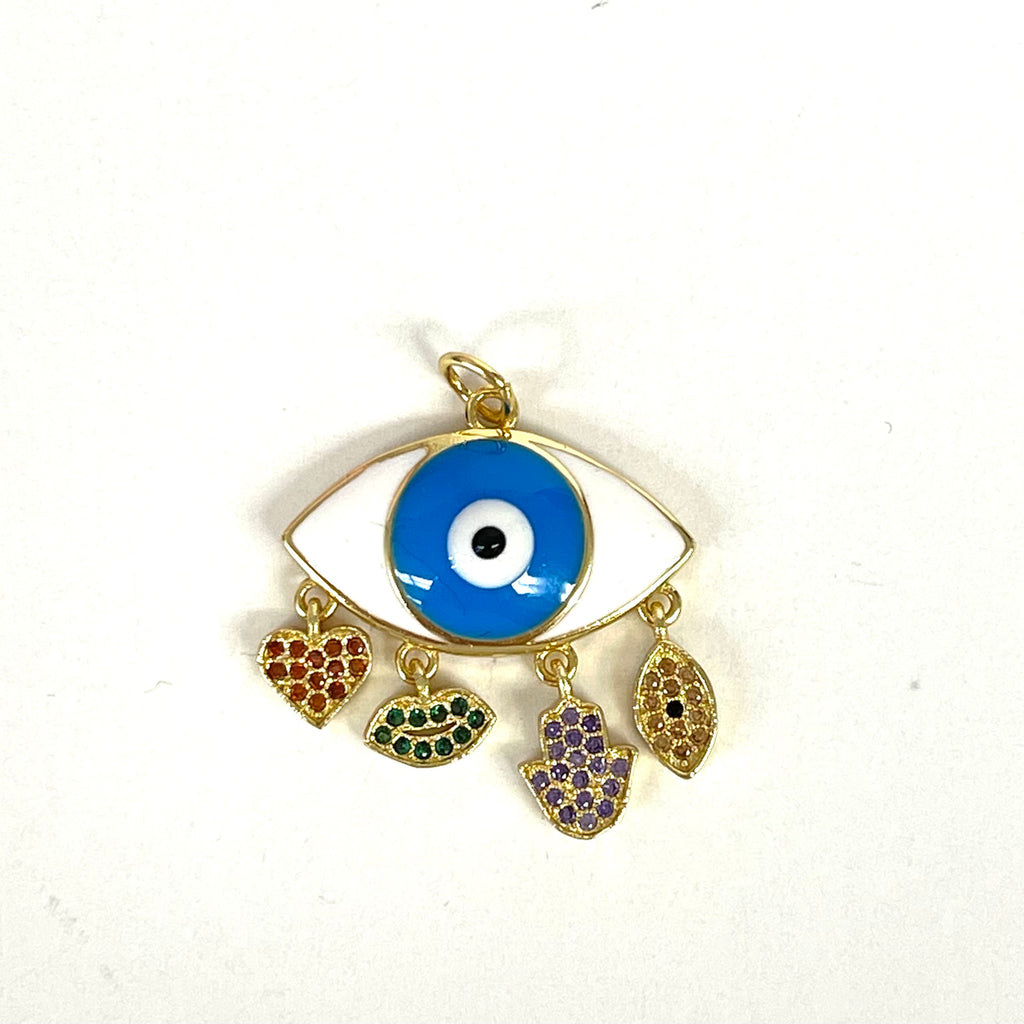 Enamel with hanging micro pavé cubic zirconia heart, lips, hamsa, and eye.