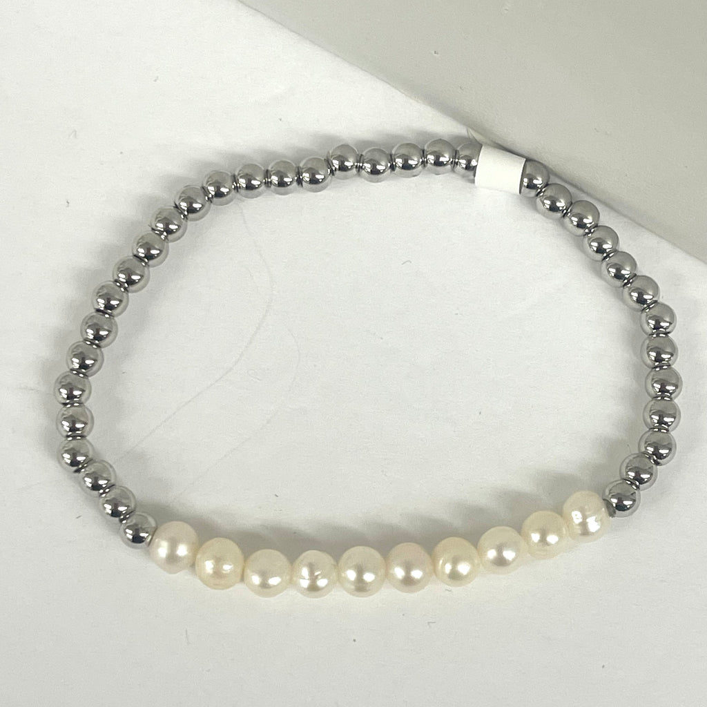 These 4mm beaded bracelets are headlined with 10 soft water pearls. Wear them alone or stack with others.