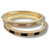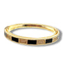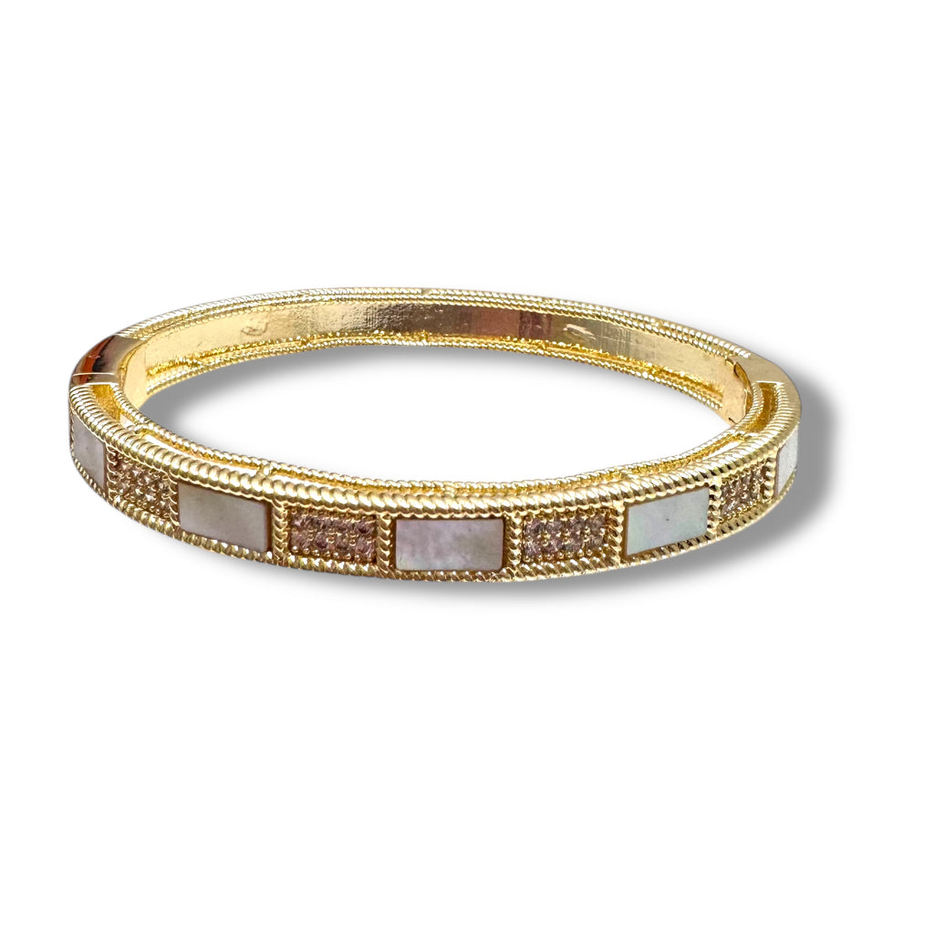 This bracelet features pave cz rectangles alternating with either mother of pearl or onyx rectangles on the front. The back is smooth gold with textured edges.