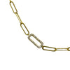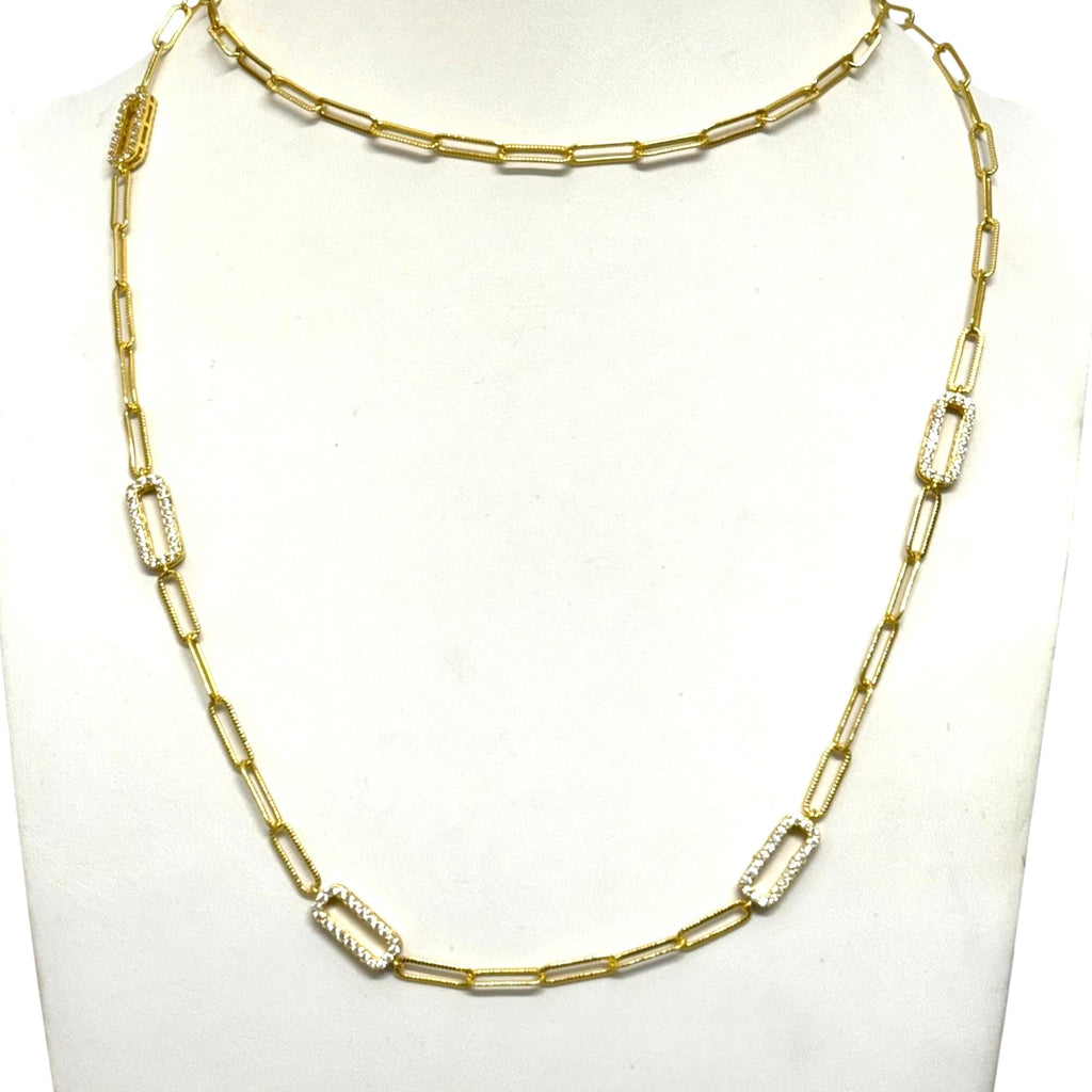 This 36" statement necklace features a textured paperclip chain with 7 clear pave rectangles. Lobster clasp closure.