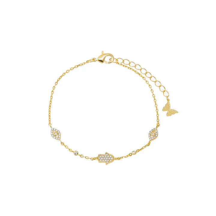 This gold bracelet features two 1/4"L x 1/8"W pave cz evil eye charms, a 5/16"L x 1/4"W pave cz hamsa charm and two bezel set cz.