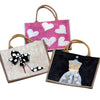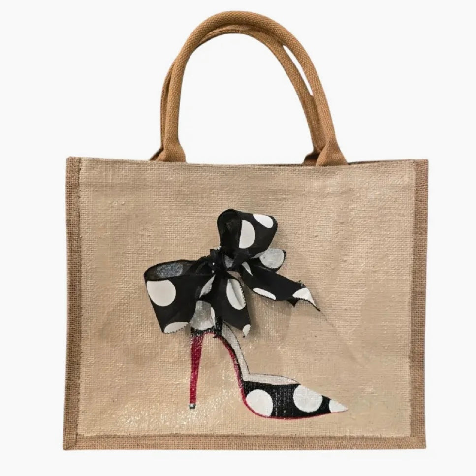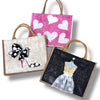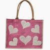 Beautiful hand painted and embellished pink metallic tote bag with white beaded hearts. Hand painted original design. Accented with beads. Protected with resin for shine and lasting beauty. 15.” w x 12” h x 6” d. Bags are made mainly from natural burlap jute fabric and canvas. Durable and can stand on its own. PE film lining. Water-proof and easy to clean with a soft cloth and warm water. Not machine washable. Sturdy handles.Hand painted and embellished