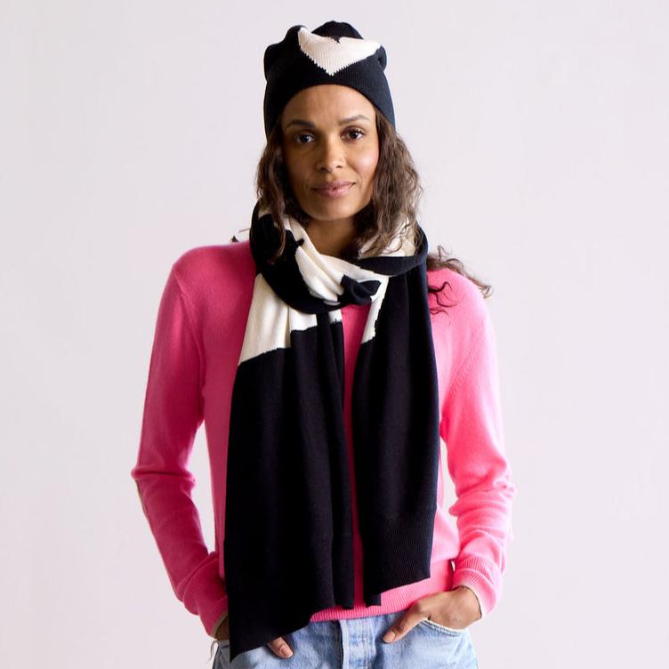 The Love Scarf, is pure affection and made of a cotton/cashmere blend which makes it wearable in any climate. Our Love Scarf features Kerri's uplifting artwork from her painting Love Lines. Pair with the matching mitten and hat. Great to get and great to gift.
