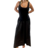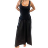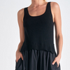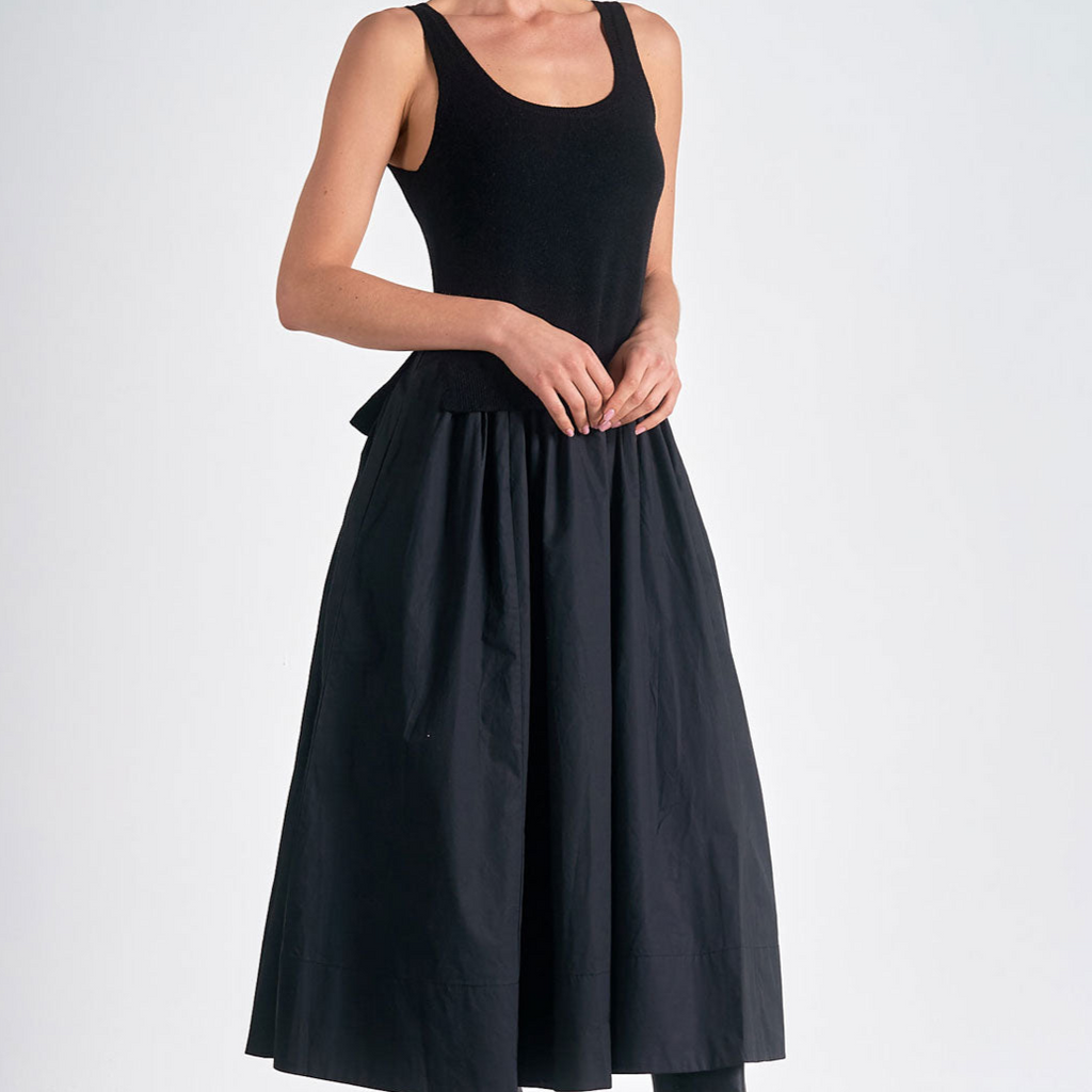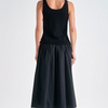 This midi length dress features a knit tank with cotton skirt. Two on-seam side pockets.