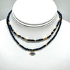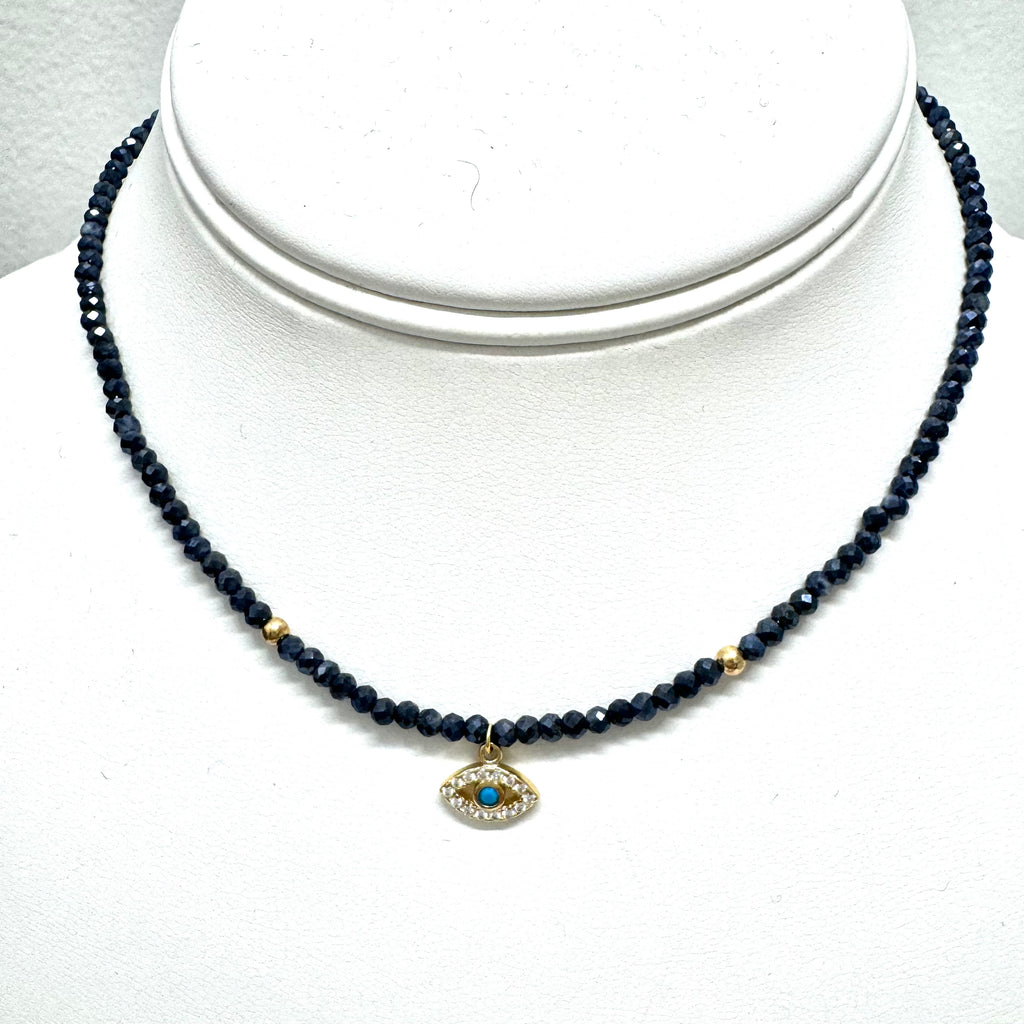 These necklaces feature lapis faceted beads and smooth gold beads. Choose from two styles: lapis with gold beads or lapis with evil eye charm.