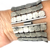 102 silver squares attached by metal loops to connect them to create the liquid feeling of the bracelet.