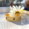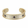This gold, vintage style cuff features black clovers encircled with pave cz and cz sprinkled throughout. This thick gold cuff that is easy to size to your wrist. Makes a great addition to your daily bracelet stack.