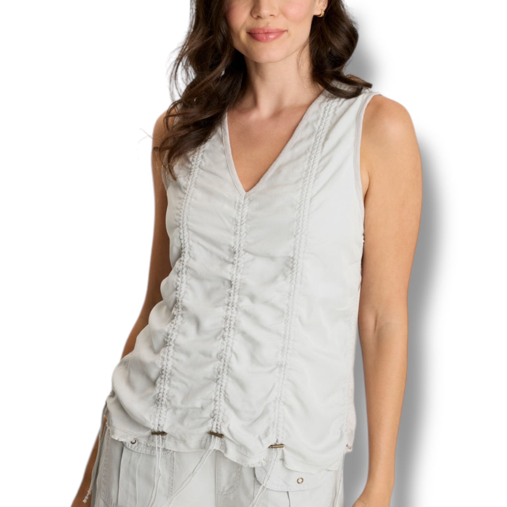 • This v-neck twill tank gets a dose of detail with multiple adjustable corded channels throughout for some tactical inspiration that elevates this classically-comfy silhouette.