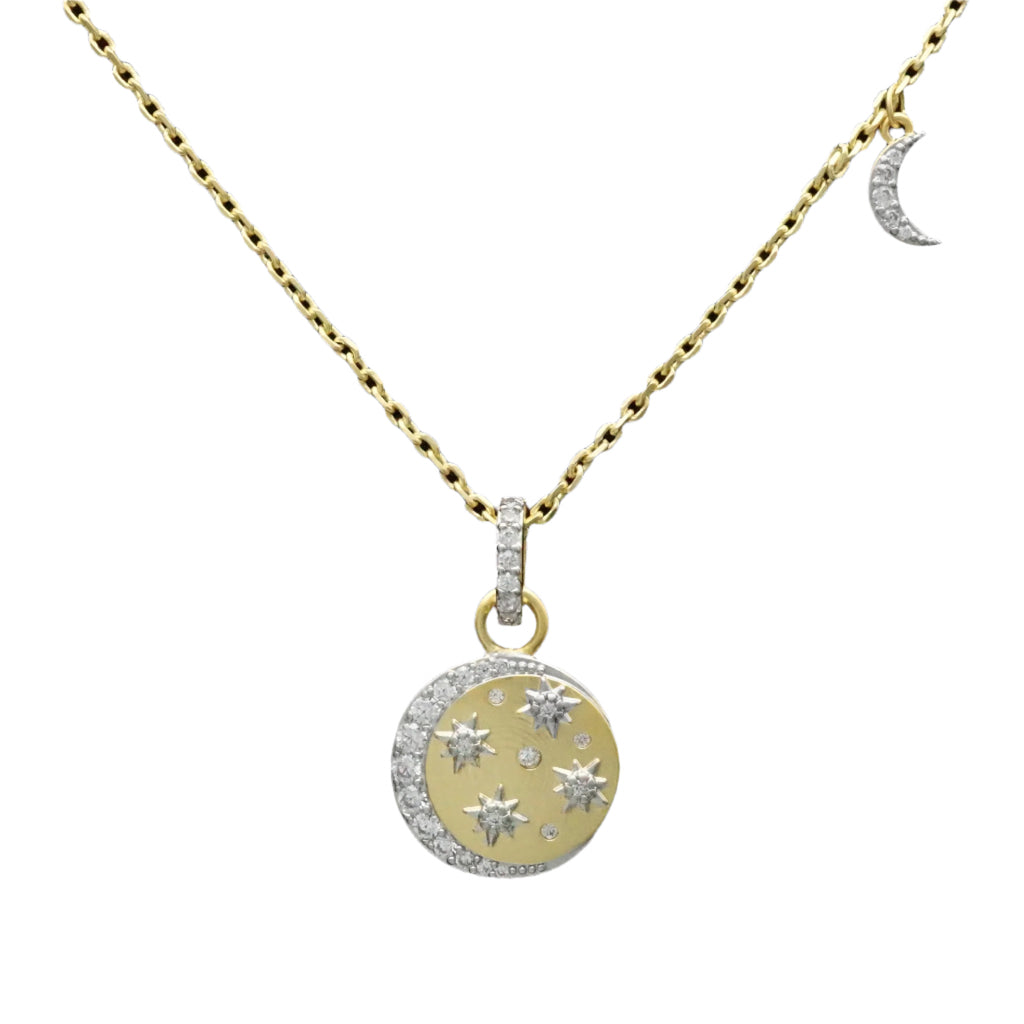 Pave bail connects to the goldtone chain and a tiny 1/4" moon dangles off the chain to the side