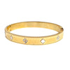 This gold bangle bracelet features five alternating stations of pave cz and mother clovers.