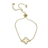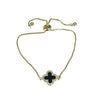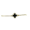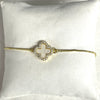 Gold clover charm has mother of pearl center with cz surround; reverse side is black enamel with cz surround