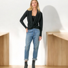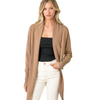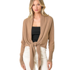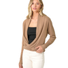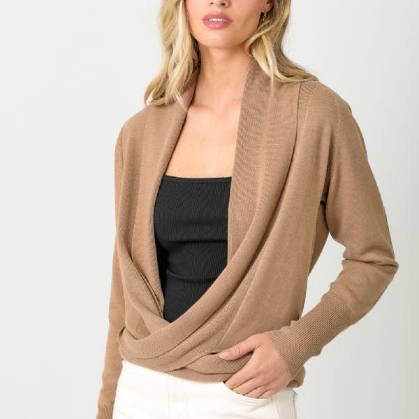 This sweater is a great transitional piece for fall. You can wear it multiple ways: open, tied in front, or wrapped and buttoned in back. It features a draped lapel and long sleeves with ribbed 6 1/2" ribbed cuffs.