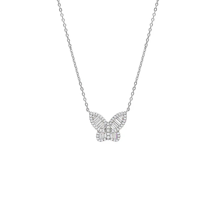 Make any outfit you flaunt take flight with this pave and baguette butterfly necklace, featuring a cute butterfly pendant, adorned in sparkly pave and baguette czs. Wear this gem alone or with another necklace for a lovely, layered look. It's the perfect way to add a touch of elegance to your everyday style.