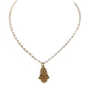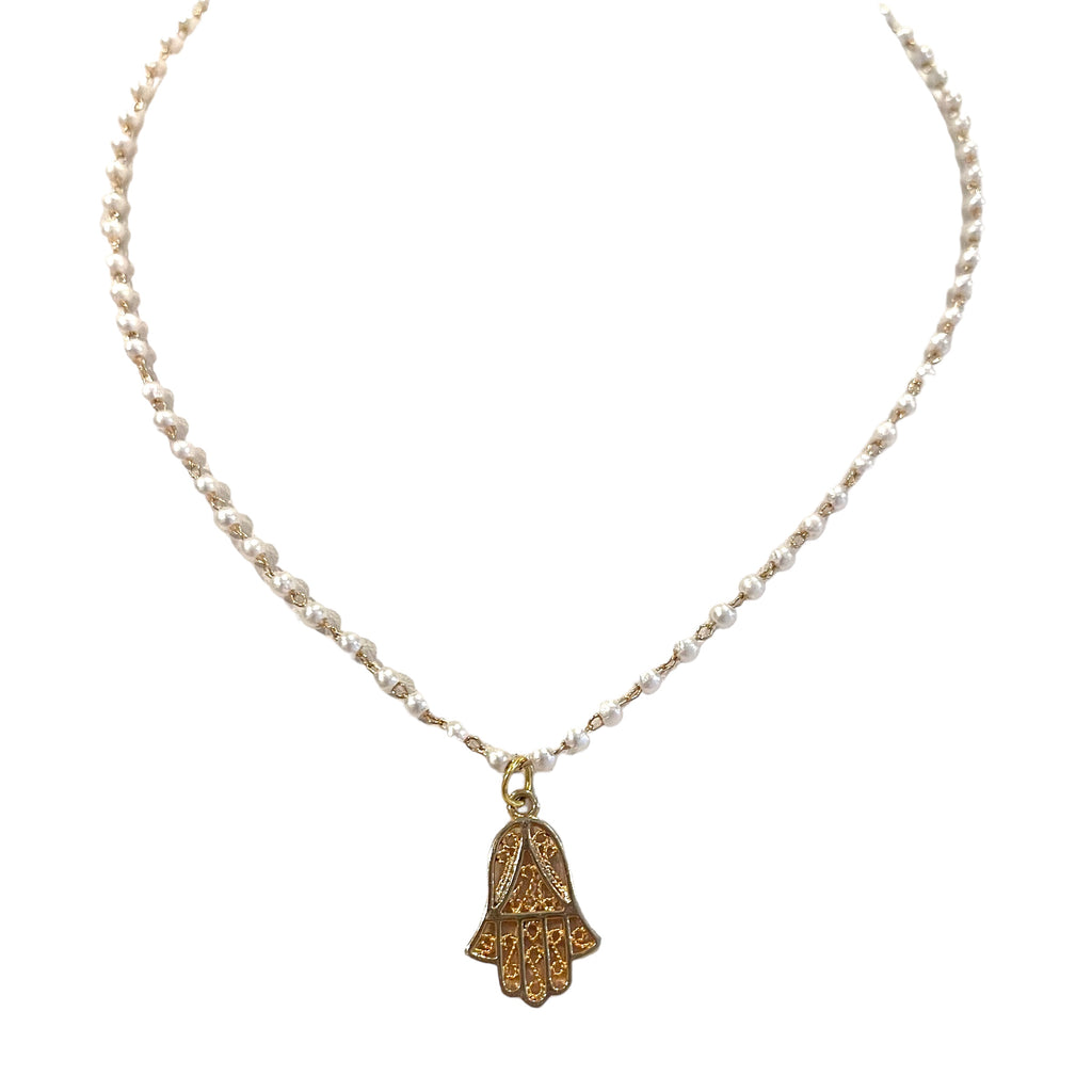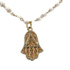 Dainty pearl necklace with 3/4" filigree hamsa charm