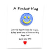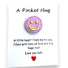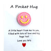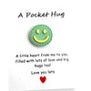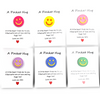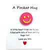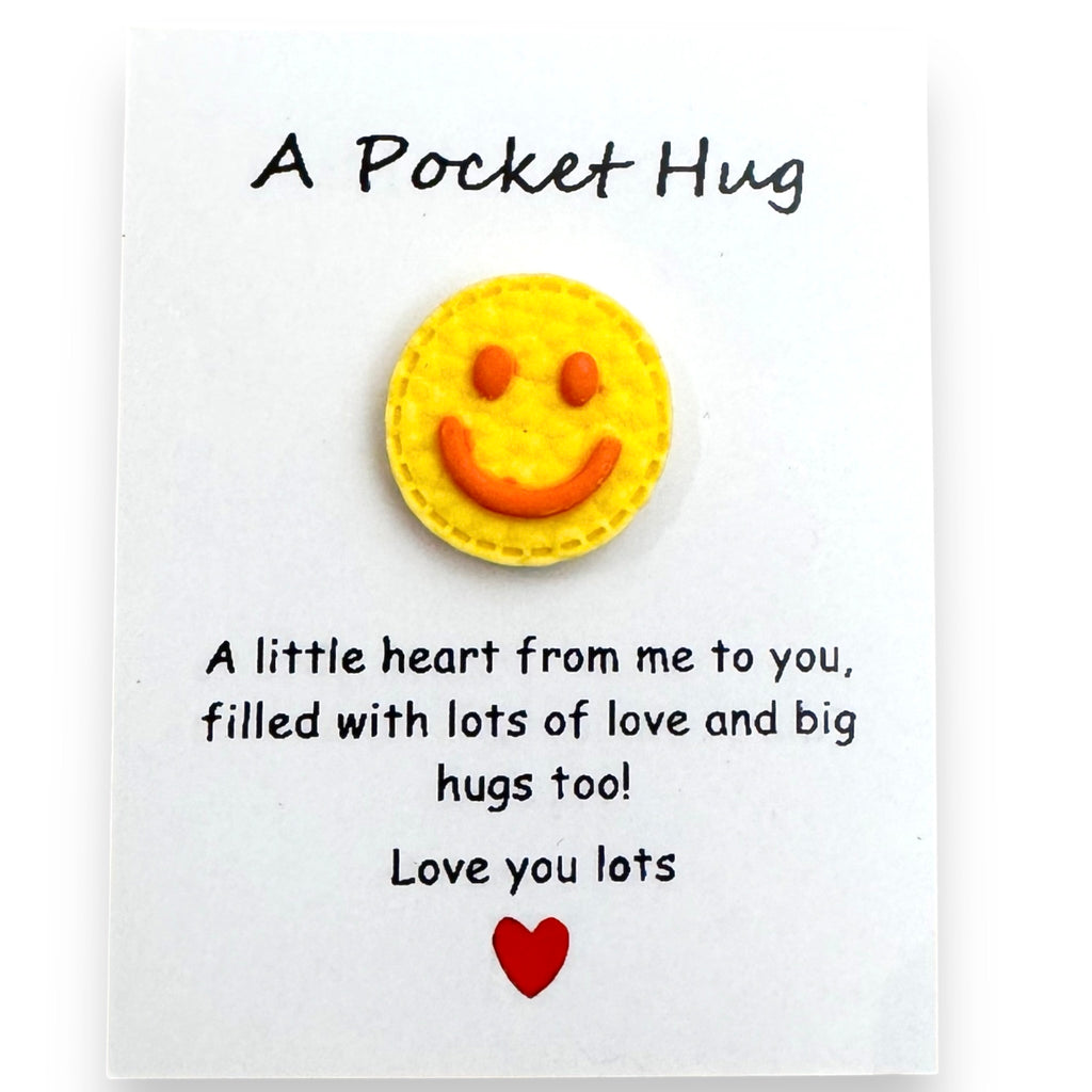 Smiley Disc (7/8" diam.) comes in Yellow/Orange; Blue/Yellow; Light Pink/Yellow; Bright Pink/Yellow; Mint Green/Yellow; and Lavender/Yellow -- card reads: A Pocket Hug "Little heart from me to you filled with lots of love and big hugs too!