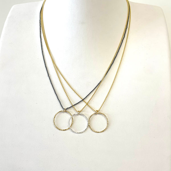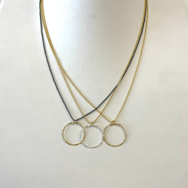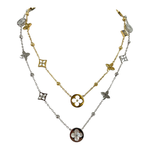 Seven mother of pearl clovers wrapped in bezel gold. This delicate necklace will add glamour to any outfit.