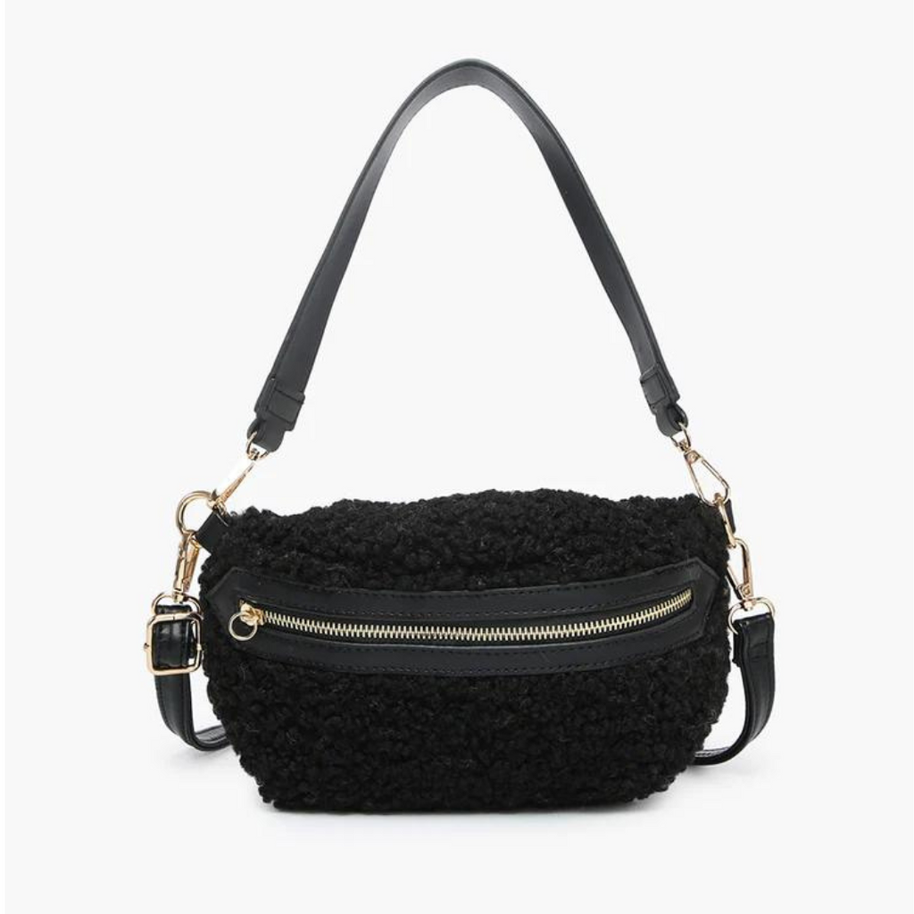 This adorable sherpa sling bag has a removable vegan 19” x 1.5" shoulder strap. A gold zipper with a vegan outline adorns the front. A back gold zipper pocket is a great stash. An adjustable strap 29”-47”L .75"W is included. The bag is 11"L and 6" W and has a back interior zip pocket and 2 front interior card pockets.