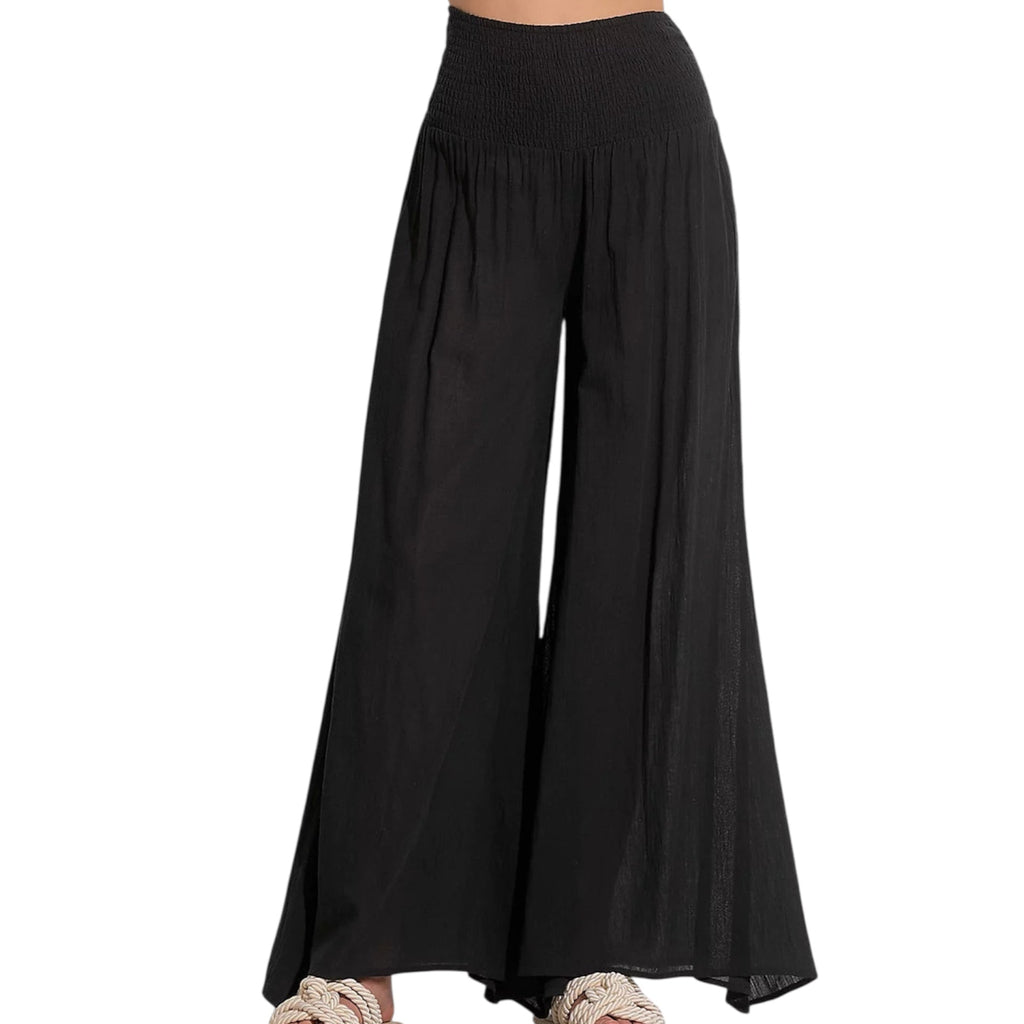 This wide-leg pant features a 3" wide smocked waist for all day comfort.