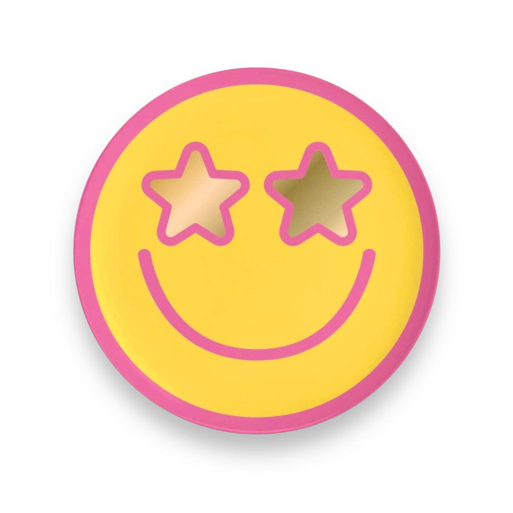 This round trinket tray is the perfect gift. The pink and gold smiley face design with stars for eyes has a vintage feel and is sure to delight and brighten up your dresser, vanity, or nightstand. Terrific for mom, friend, sister, co-worker. Keep all your treasured rings and small jewelry items safe in this adorable little dish!