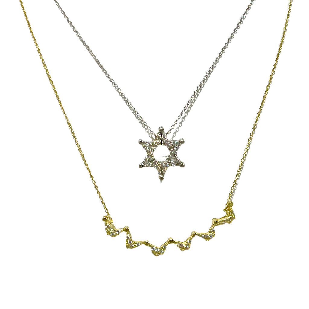 This unique necklace features cubic zirconia for added sparkle. It can be worn in two ways, held together by a strong magnet or unlocked and unfolded. The design is inspired by the history of the Jewish people during the Spanish Inquisition when they would wear Star of David necklaces that could unfold into butterflies. This symbolizes resilience and hope even in the face of adversity.