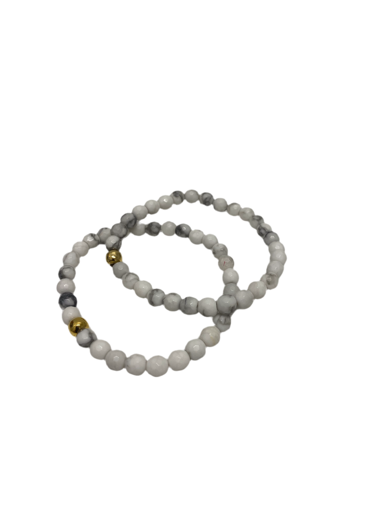These 3 mm marble stretch bracelets are great for stacking. Each bracelet has a bright gold bead as well. Each bracelet is 2.5” in diameter.